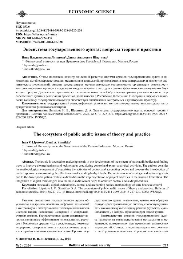 Липатова, И.В. Экосистема государственного аудита: вопросы теории и практики / И.В. Липатова, Д.А. Шаститко // Вестник экономической безопасности. – 2024. – № 5. — С. 227-230. — Только в электронном виде. — <URL:http://elib.fa.ru/art2024/bv3533.pdf>.