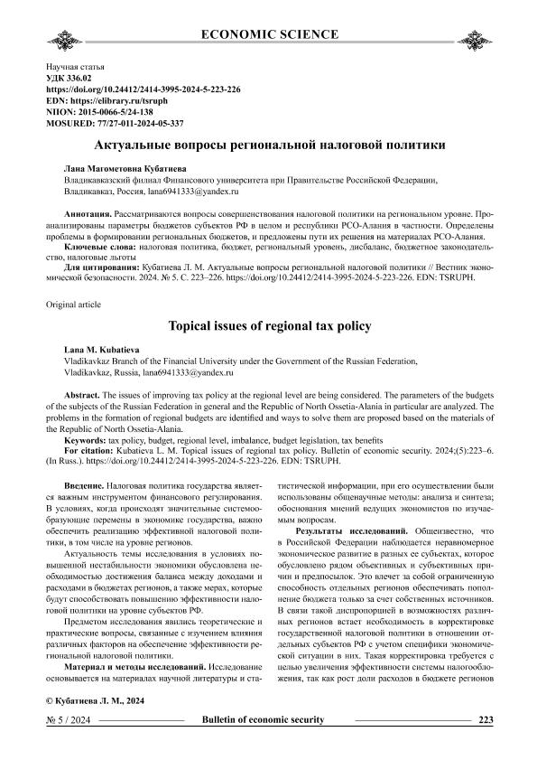 Кубатиева, Л.М. Актуальные вопросы региональной налоговой политики // Вестник экономической безопасности. – 2024. – № 5. — С. 223-226. — Только в электронном виде. — <URL:http://elib.fa.ru/art2024/bv3534.pdf>.