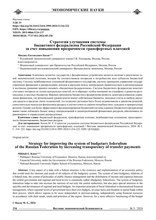 Косов, М.Е. Стратегия улучшения системы бюджетного федерализма Российской Федерации за счет повышения прозрачности трансфертных платежей // Вестник экономической безопасности. – 2024. – № 5. — С. 216-222. — Только в электронном виде. — <URL:http://elib.fa.ru/art2024/bv3535.pdf>.