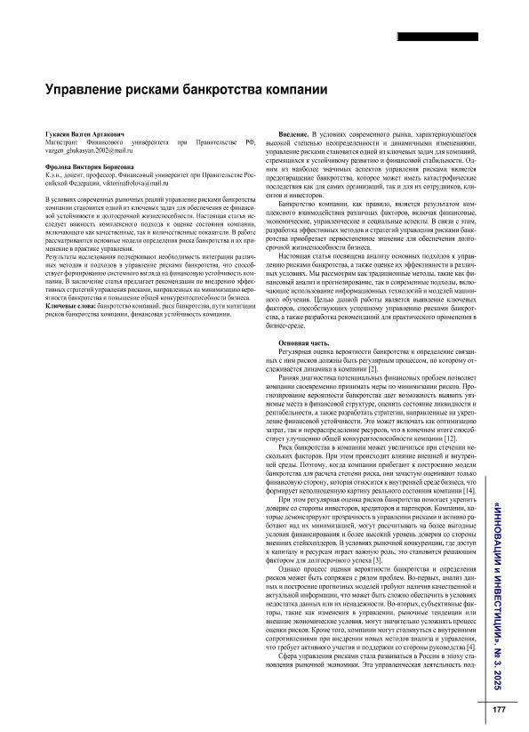 Гукасян, В.А. Управление рисками банкротства компании / В.А. Гукасян, В.Б. Фролова // Инновации и инвестиции. – 2025. – № 3. — С. 177-180. — Только в электронном виде. — <URL:http://elib.fa.ru/art2025/bv1509.pdf>.