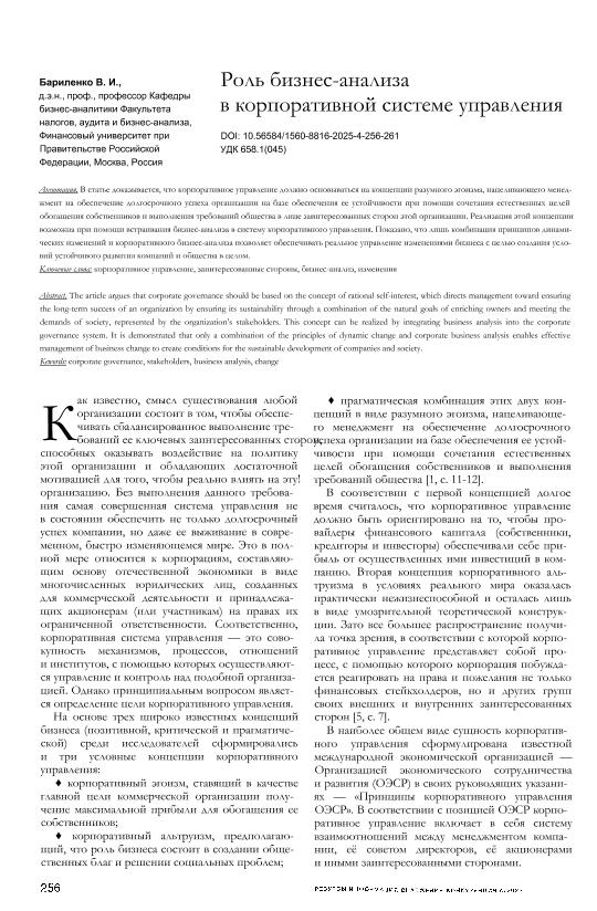 Бариленко, В.И. Роль бизнес-анализа в корпоративной системе управления // Риск: ресурсы, информация, снабжение, конкуренция. – 2025. – С. 256-261. — Хранение – Олеко Дундича, 23. — <URL:http://elib.fa.ru/art2025/bv1791.pdf>.