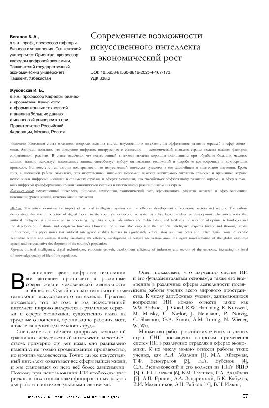 Бегалов, Б.А. Современные возможности искусственного интеллекта и экономический рост / Б.А. Бегалов, И.Б. Жуковская // Риск: ресурсы, информация, снабжение, конкуренция. – 2025. – С. 167-173. — Хранение – Олеко Дундича, 23. — <URL:http://elib.fa.ru/art2025/bv1792.pdf>.
