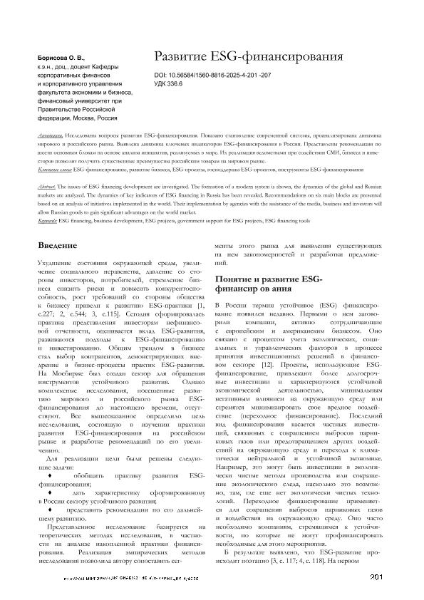 Борисова, О.В. Развитие ESG-финансирования // Риск: ресурсы, информация, снабжение, конкуренция. – 2025. – С. 201-207. — Хранение – Олеко Дундича, 23. — <URL:http://elib.fa.ru/art2025/bv1793.pdf>.