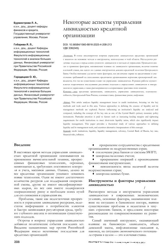 Бурмистрова, Л.А. Некоторые аспекты управления ликвидностью кредитной организации / Л.А. Бурмистрова, Я.Л. Гобарева, О.Ю. Городецкая // Риск: ресурсы, информация, снабжение, конкуренция. – 2025. – С. 208-213. — Хранение – Олеко Дундича, 23. — <URL:http://elib.fa.ru/art2025/bv1794.pdf>.
