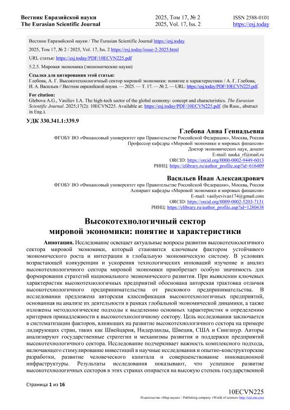 Глебова, А.Г. Высокотехнологичный сектор мировой экономики: понятие и характеристики / А.Г. Глебова, И.А. Васильев. — Текст: электронный // Вестник Евразийской науки. – 2025. – № 2. — URL: https://esj.today/PDF/10ECVN225.pdf (дата обращения: 20.10.2025) — <URL:http://elib.fa.ru/art2025/bv442.pdf>.