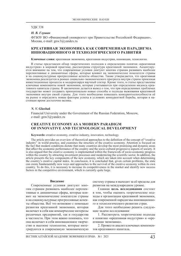 Глушак, Н.В. Креативная экономика как современная парадигма инновационного и технологического развития // Вестник Алтайской академии экономики и права. – 2025. – № 1. — С. 43-47. — Только в электронном виде. — <URL:http://elib.fa.ru/art2025/bv443.pdf>.