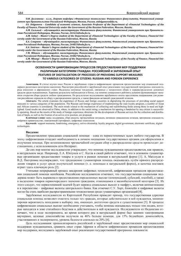 Особенности цифровизации процессов предоставления мер поддержки различным категориям граждан: российский и зарубежный опыт / О.И. Долганова, А.М. Сальный, Е.А. Смирнов, Г.М. Мбанги // Вестник Академии знаний. – 2025. – № 3. — С. 584-588. — Только в электронном виде. — <URL:http://elib.fa.ru/art2025/bv976.pdf>.