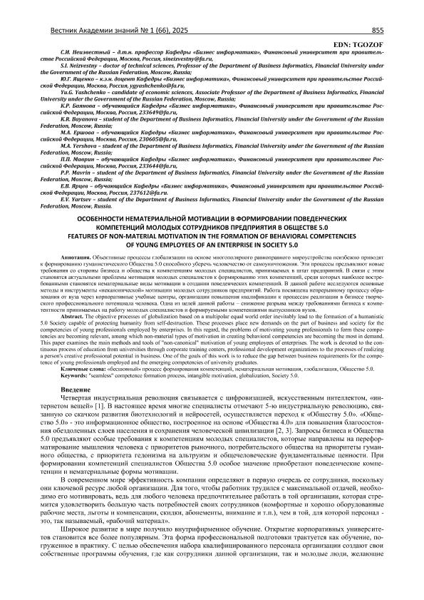 Особенности нематериальной мотивации в формировании поведенческих компетенций молодых сотрудников предприятия в Обществе 5.0 / С.И. Неизвестный, Ю.Г. Ященко, К.Р. Баянова [и др.] // Вестник Академии знаний. – 2025. – № 1. — С. 855-862. — Только в электронном виде. — <URL:http://elib.fa.ru/art2025/bv977.pdf>.