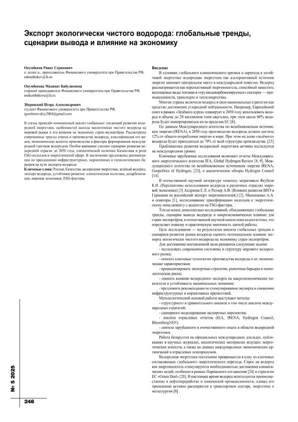 Окумбеков, Р.С. Экспорт экологически чистого водорода: глобальные тренды, сценарии вывода и влияние на экономику / Р.С. Окумбеков, М.Б. Окумбекова, И.А. Зборовский // Экономика строительства. – 2025. – № 5. — С. 248-252. — Только в электронном виде. — <URL:http://elib.fa.ru/art2025/bv978.pdf>.
