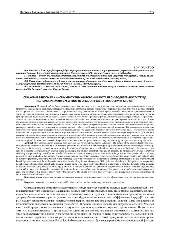 Павлова, И.В. Страховые взносы как инструмент стимулирования роста производительности труда / И.В. Павлова, Д.В. Пожарова // Вестник Академии знаний. – 2025. – № 2. — С. 785-789. — Только в электронном виде. — <URL:http://elib.fa.ru/art2025/bv979.pdf>.