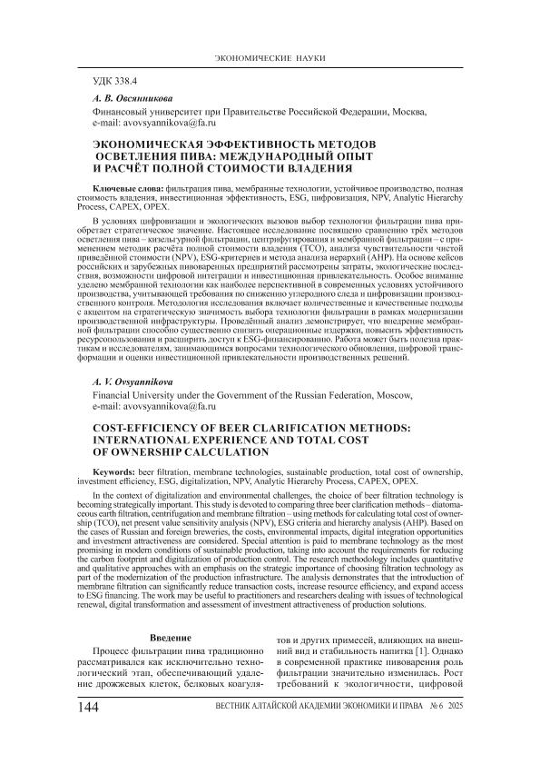 Овсянникова, А.В. Экономическая эффективность методов осветления пива: международный опыт и расчёт полной стоимости владения // Вестник Алтайской академии экономики и права. – 2025. – № 6. — С. 144-149. — Только в электронном виде. — <URL:http://elib.fa.ru/art2025/bv980.pdf>.