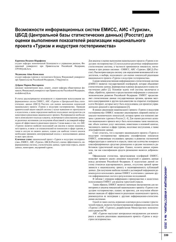Каримова, Н.Ш. Возможности информационных систем ЕМИСС, АИС «Туризм», ЦБСД (Центральной базы статистических данных) (Росстат) для оценки выполнения показателей реализации национального проекта «Туризм и индустрия гостеприимства» / Н.Ш. Каримова, А.К. Меджидова, М.В. Дуброва // Инновации и инвестиции. – 2025. – № 4. — С. 339-341. — Только в электронном виде. — <URL:http://elib.fa.ru/art2025/bv1295.pdf>.