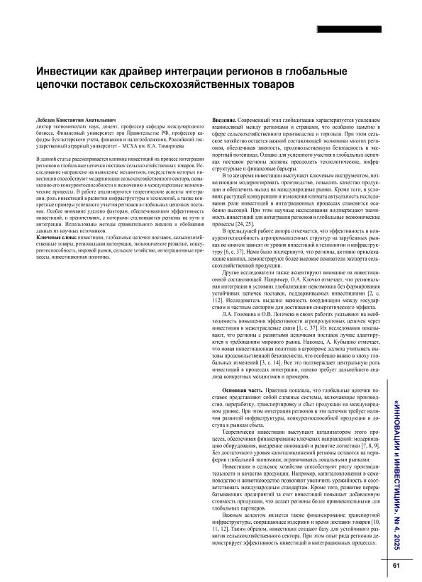 Лебедев, К.А. Инвестиции как драйвер интеграции регионов в глобальные цепочки поставок сельскохозяйственных товаров // Инновации и инвестиции. – 2025. – № 4. — С. 61-64. — Только в электронном виде. — <URL:http://elib.fa.ru/art2025/bv1296.pdf>.