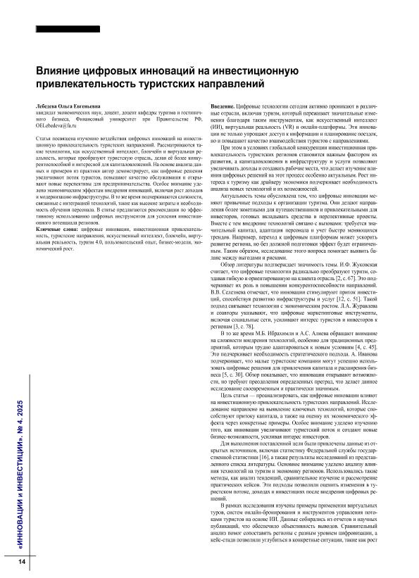 привлекательность туристских направлений // Инновации и инвестиции. – 2025. – № 4. — С. 14-17. — Только в электронном виде. — <URL:http://elib.fa.ru/art2025/bv1297.pdf>.