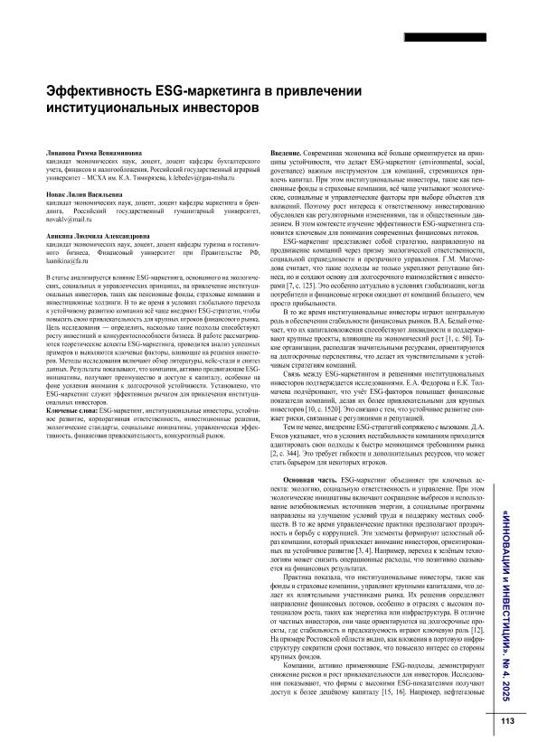 институциональных инвесторов / Р.В. Ливанова, Л.В. Новак, Л.А. Аникина // Инновации и инвестиции. – 2025. – № 4. — С. 113-116. — Только в электронном виде. — <URL:http://elib.fa.ru/art2025/bv1298.pdf>.