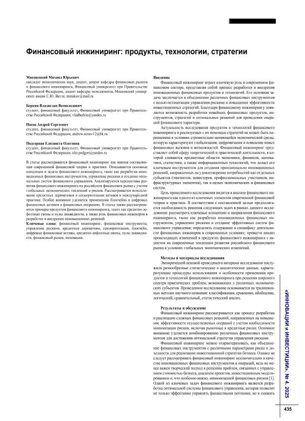 Финансовый инжиниринг: продукты, технологии, стратегии / М.Ю. Маковецкий, В.В. Беркин, А.С. Носов, Е.О. Подгорная // Инновации и инвестиции. – 2025. – № 4. — С. 435-439. — Только в электронном виде. — <URL:http://elib.fa.ru/art2025/bv1299.pdf>.
