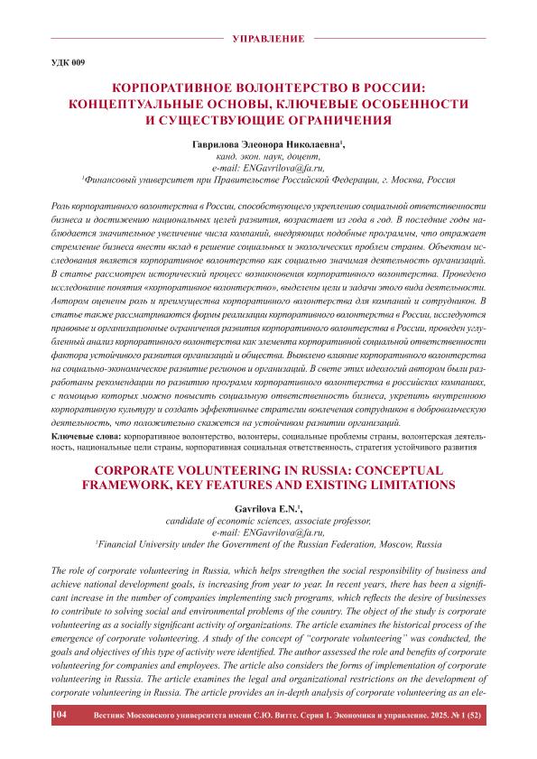 Гаврилова, Э.Н. Корпоративное волонтерство в России: концептуальные основы, ключевые особенности и существующие ограничения // Вестник Московского университета имени С.Ю. Витте. Серия 1: Экономика и управление. – 2025. – № 1. — С. 104-114. — Только в электронном виде. — <URL:http://elib.fa.ru/art2025/bv1300.pdf>.