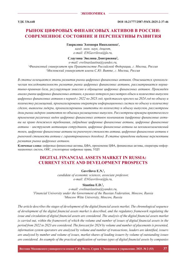 Гаврилова, Э.Н. Рынок цифровых финансовых активов в России: современное состояние и перспективы развития / Э.Н. Гаврилова, Э.Д. Слаутина // Вестник Московского университета имени С.Ю. Витте. Серия 1: Экономика и управление. – 2025. – № 2. — С. 37-46. — Только в электронном виде. — <URL:http://elib.fa.ru/art2025/bv1301.pdf>.