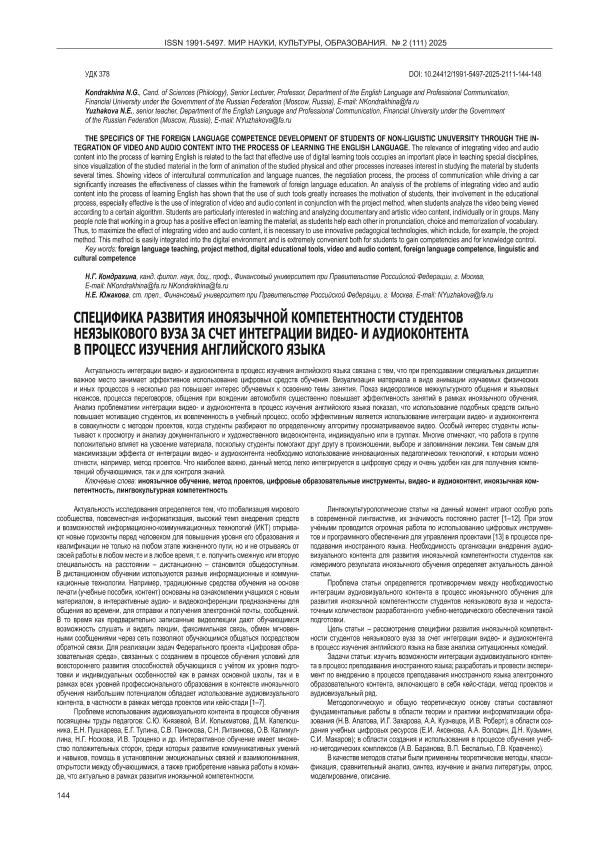 Кондрахина, Н.Г. Специфика развития иноязычной компетентности студентов неязыкового вуза за счет интеграции видео- и аудиоконтента в процесс изучения английского языка // Мир Науки, Культуры, Образования. – 2025. – № 2. — С. 144-148. — Только в электронном виде. — <URL:http://elib.fa.ru/art2025/bv1302.pdf>.
