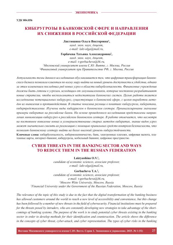 Лактюшина, О.В. Киберугрозы в банковской сфере и направления их снижения в Российской Федерации / О.В. Лактюшина, Т.А. Горбачева // Вестник Московского университета имени С.Ю. Витте. Серия 1: Экономика и управление. – 2025. – № 1. — С. 27-40. — Только в электронном виде. — <URL:http://elib.fa.ru/art2025/bv1303.pdf>.