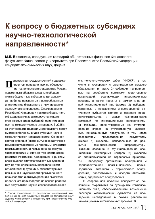 Васюнина, М.Л. К вопросу о бюджетных субсидиях научно-технологической направленности // Финансы. – 2025. – № 9. — С. 11-18 — <URL:http://elib.fa.ru/art2025/bv420.pdf>.