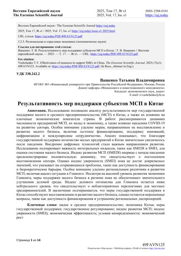 Ващенко, Т.В. Результативность мер поддержки субъектов МСП в Китае. — Текст: электронный // Вестник Евразийской науки. – 2025. – № s1. — URL: https://esj.today/PDF/49FAVN125.pdf (дата обращения: 17.09.2025) — <URL:http://elib.fa.ru/art2025/bv421.pdf>.