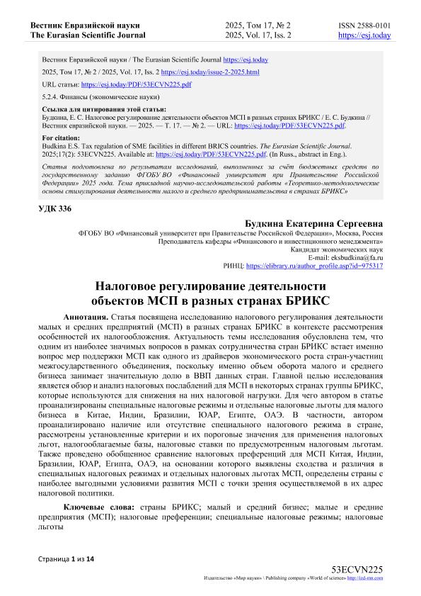 Будкина, Е.С. Налоговое регулирование деятельности объектов МСП в разных странах БРИКС. — Текст: электронный // Вестник Евразийской науки. – 2025. – № 2. — URL: https://esj.today/PDF/53ECVN225.pdf (дата обращения: 20.10.2025) — <URL:http://elib.fa.ru/art2025/bv422.pdf>.