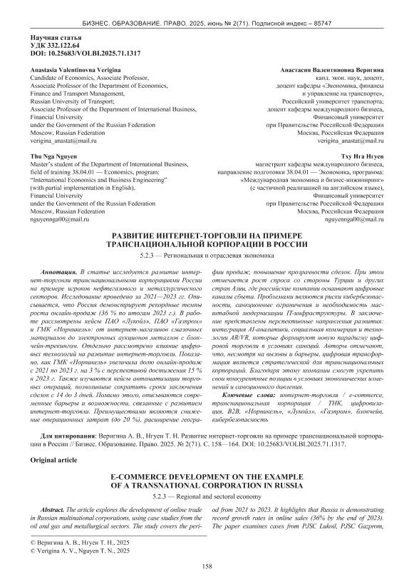 Веригина, А.В. Развитие интернет-торговли на примере транснациональной корпорации в России / А.В. Веригина, Т.Н. Нгуен // Бизнес. Образование. Право. – 2025. – № 2. — С. 158-164. — Только в электронном виде. — <URL:http://elib.fa.ru/art2025/bv423.pdf>.