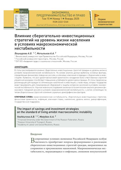 Вешкурова, А.Б. Влияние сберегательно-инвестиционных стратегий на уровень жизни населения в условиях макроэкономической нестабильности / А.Б. Вешкурова, А.А. Мотыльков // Экономика, предпринимательство и право. – 2025. – № 1. — С. 705-718. — Только в электронном виде. — <URL:http://elib.fa.ru/art2025/bv424.pdf>.