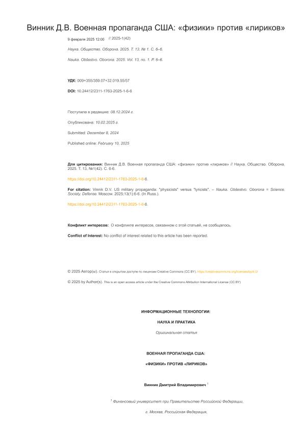 Винник, Д.В. Военная пропаганда США: «физики» против «лириков». — Текст: электронный // Наука. Общество. Оборона. – 2025. – № 1. — URL: https://doi.org/10.24412/2311-1763-2025-1-6-6. - Дата публикации: 10.02.2025 — <URL:http://elib.fa.ru/art2025/bv425.pdf>.