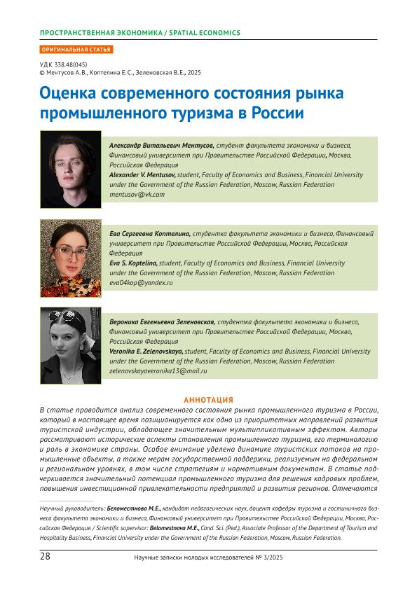 промышленного туризма в России / А.В. Ментусов, Е.С. Коптелина, В.Е. Зеленовская // Научные записки молодых исследователей. – 2025. – № 3. — С. 28-36 — <URL:http://elib.fa.ru/art2025/bv931.pdf>.