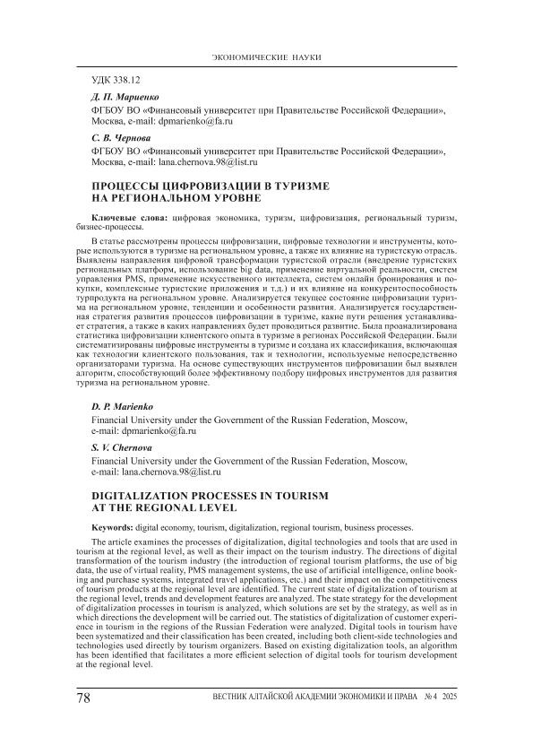 Мариенко, Д.П. Процессы цифровизации в туризме на региональном уровне / Д.П. Мариенко, С.В. Чернова // Вестник Алтайской академии экономики и права. – 2025. – № 4-1. — С. 78-83. — Только в электронном виде. — <URL:http://elib.fa.ru/art2025/bv932.pdf>.
