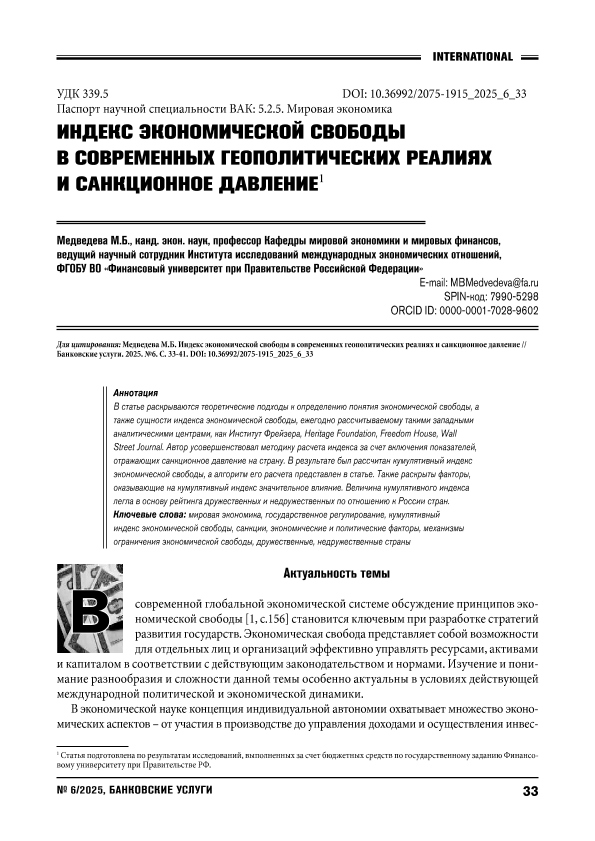 Медведева, М.Б. Индекс экономической свободы в современных геополитических реалиях и санкционное давление // Банковские услуги. – 2025. – № 6. — С. 33-41. — Только в электронном виде. — <URL:http://elib.fa.ru/art2025/bv933.pdf>.