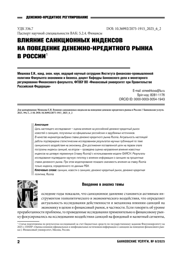 Мешкова, Е.И. Влияние санкционных индексов на поведение денежно-кредитного рынка в России // Банковские услуги. – 2025. – № 6. — С. 2-6. — Только в электронном виде. — <URL:http://elib.fa.ru/art2025/bv935.pdf>.