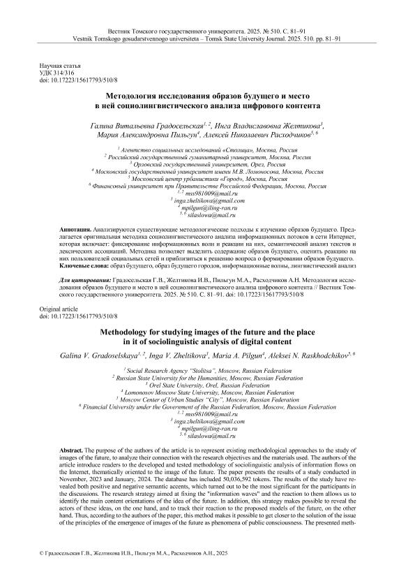 Методология исследования образов будущего и место в ней социолингвистического анализа цифрового контента / Г.В. Градосельская, И.В. Желтикова, М.А. Пильгун, А.Н. Расходчиков // Вестник Томского государственного университета. – 2025. – № 510. — С. 81-91. — Только в электронном виде. — <URL:http://elib.fa.ru/art2025/bv936.pdf>.