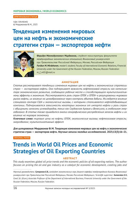 Мирджонов, Ф.М. Тенденция изменения мировых цен на нефть и экономические стратегии стран — экспортеров нефти // Научные записки молодых исследователей. – 2025. – № 3. — С. 16-21 — <URL:http://elib.fa.ru/art2025/bv937.pdf>.