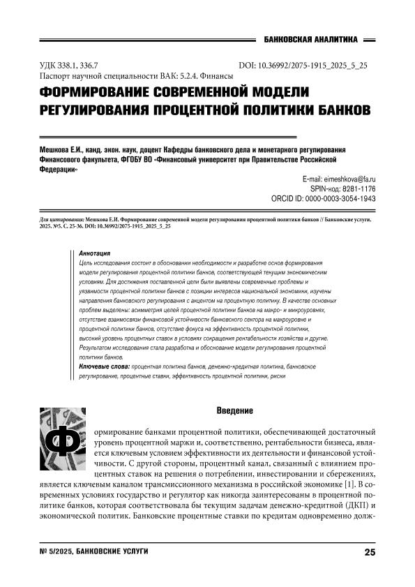 Мешкова, Е.И. Формирование современной модели регулирования процентной политики банков // Банковские услуги. – 2025. – № 5. — С. 25-36. — Только в электронном виде. — <URL:http://elib.fa.ru/art2025/bv938.pdf>.