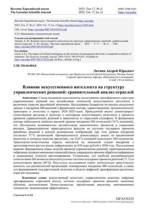 Литвин, А.Ю. Влияние искусственного интеллекта на структуру управленческих решений: сравнительный анализ отраслей. — Текст: электронный // Вестник Евразийской науки. – 2025. – № s3. — URL: https://esj.today/PDF/34FAVN325.pdf (дата обращения: 12.12.2025) — <URL:http://elib.fa.ru/art2025/bv1263.pdf>.
