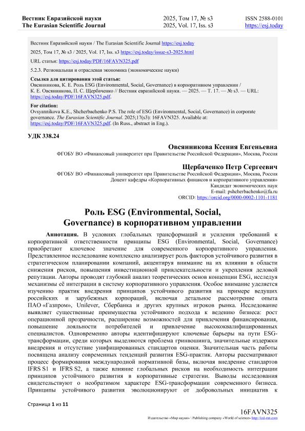 Овсянникова, К.Н. Роль ESG (Environmental, Social, Governance) в корпоративном управлении / К.Н. Овсянникова, П.С. Щербаченко. — Текст: электронный // Вестник Евразийской науки. – 2025. – № s3. — URL: https://esj.today/PDF/16FAVN325.pdf (дата обращения: 11.12.2025) — <URL:http://elib.fa.ru/art2025/bv1264.pdf>.