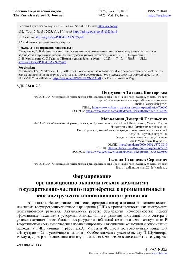 Петрусевич, Т.В. Формирование организационно-экономического механизма государственно-частного партнёрства в промышленности как инструмента инновационного развития / Т.В. Петрусевич, Д.Е. Морковкин, С.С. Галкин. — Текст: электронный // Вестник Евразийской науки. – 2025. – № s3. — URL:https://esj.today/PDF/41FAVN325.pdf (дата обращения: 10.12.2025) — <URL:http://elib.fa.ru/art2025/bv1265.pdf>.