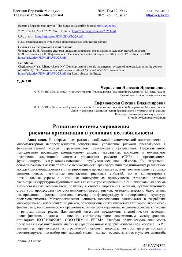 Черкасова, Н.Я. Развитие системы управления рисками организации в условиях нестабильности / Н.Я. Черкасова, О.В. Лифановская. — Текст: электронный // Вестник Евразийской науки. – 2025. – № s3. — URL: https://esj.today/PDF/42FAVN325.pdf (дата обращения: 11.12.2025) — <URL:http://elib.fa.ru/art2025/bv1266.pdf>.