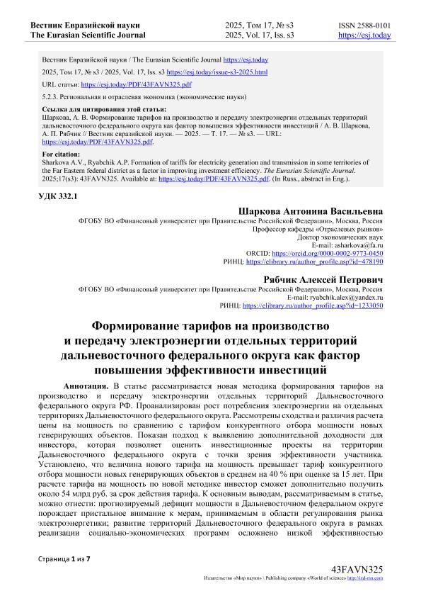 Шаркова, А.В. Формирование тарифов на производство и передачу электроэнергии отдельных территорий Дальневосточного федерального округа как фактор повышения эффективности инвестиций / А.В. Шаркова, А.П. Рябчик. — Текст: электронный // Вестник Евразийской науки. – 2025. – № s3. — URL: https://esj.today/PDF/43FAVN325.pdf (дата обращения: 11.12.2025) — <URL:http://elib.fa.ru/art2025/bv1267.pdf>.
