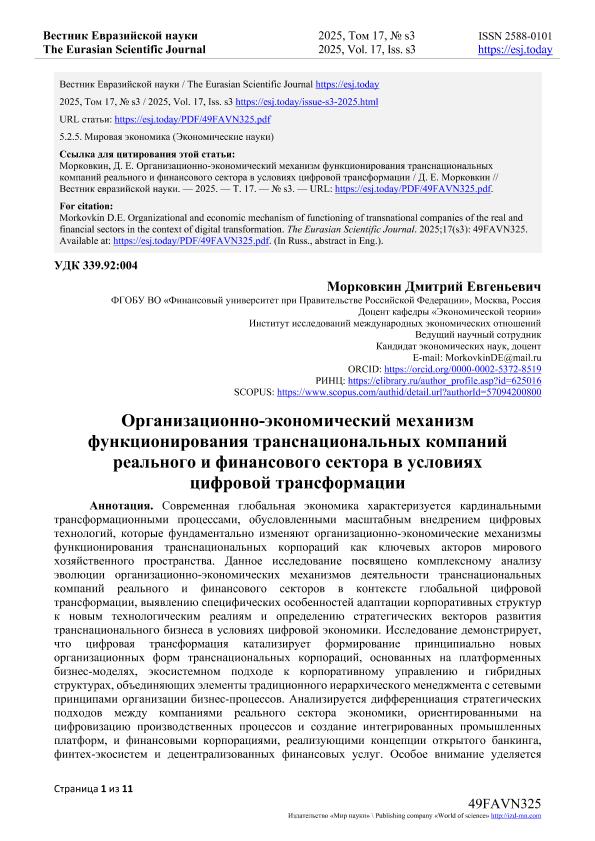 Морковкин, Д.Е. Организационно-экономический механизм функционирования транснациональных компаний реального и финансового сектора в условиях цифровой трансформации. — Текст: электронный // Вестник Евразийской науки. – 2025. – № s3. — URL: https://esj.today/PDF/49FAVN325.pdf (дата обращения: 12.12.2025) — <URL:http://elib.fa.ru/art2025/bv1268.pdf>.