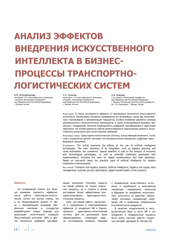 Благоразумова, Я.М. Анализ эффектов внедрения искусственного интеллекта в бизнес-процессы транспортно-логистических систем / Я.М. Благоразумова, С.П. Галкина, И.В. Шарова // Логистика. – 2025. – № 10. — С. 14-22. — Хранение - Кибальчича, 1. — <URL:http://elib.fa.ru/art2025/bv1269.pdf>.