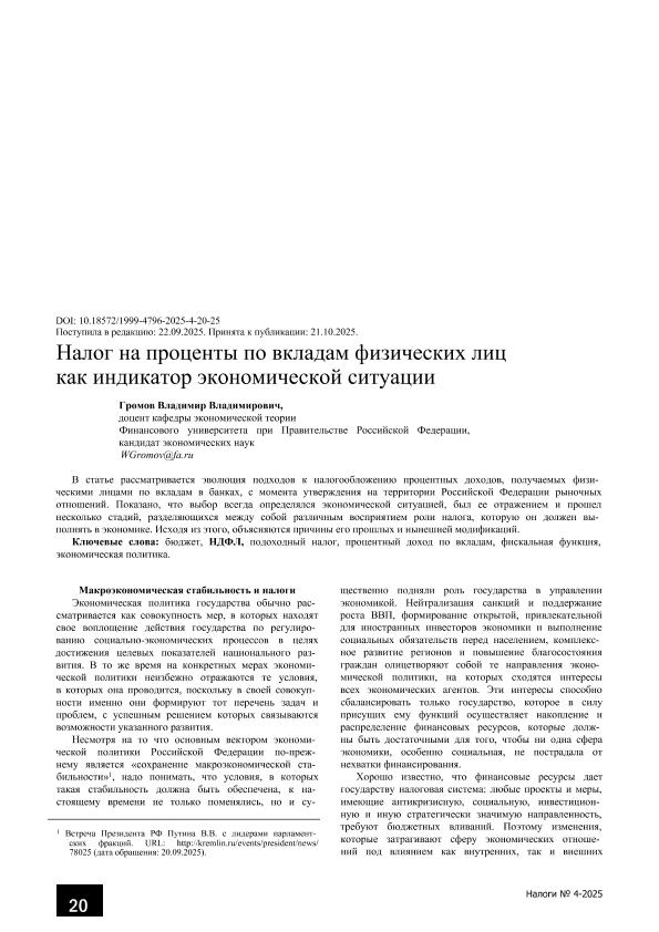 Громов, В.В. Налог на проценты по вкладам физических лиц как индикатор экономической ситуации // Налоги. – 2025. – № 4. — С. 20-25. — Хранение – Верхняя Масловка, 15. — <URL:http://elib.fa.ru/art2025/bv1270.pdf>.