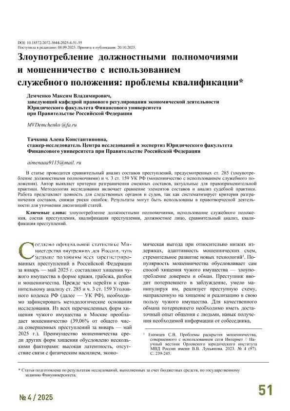 Демченко, М.В. Злоупотребление должностными полномочиями и мошенничество с использованием служебного положения: проблемы квалификации / М.В. Демченко, А.К. Тачкова // Безопасность бизнеса. – 2025. – № 4. — С. 51-55. — Хранение - Кибальчича, 1. — <URL:http://elib.fa.ru/art2025/bv1271.pdf>.
