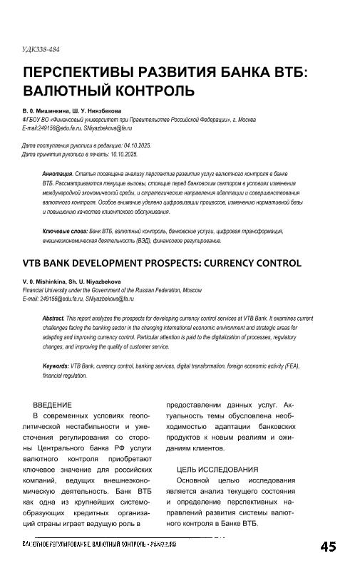 Мишинкина, В.О. Перспективы развития банка ВТБ: валютный контроль / В.О. Мишинкина, Ш.У. Ниязбекова // Валютное регулирование. Валютный контроль. – 2025. – № 11. — С. 45-49 — <URL:http://elib.fa.ru/art2025/bv1272.pdf>.