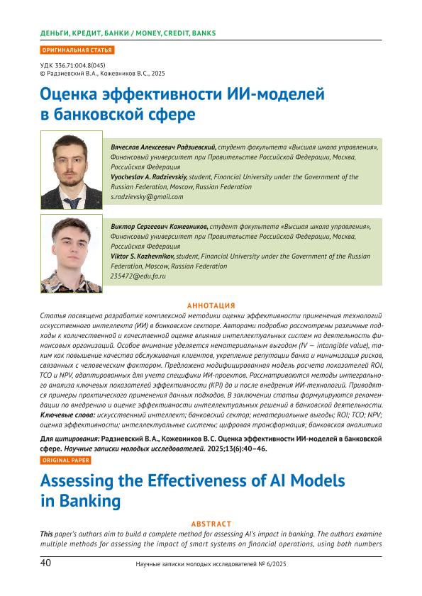 Радзиевский, В.А. Оценка эффективности ИИ-моделей в банковской сфере / В.А. Радзиевский, В.С. Кожевников // Научные записки молодых исследователей. – 2025. – № 6. — С. 40-46 — <URL:http://elib.fa.ru/art2025/bv1915.pdf>.