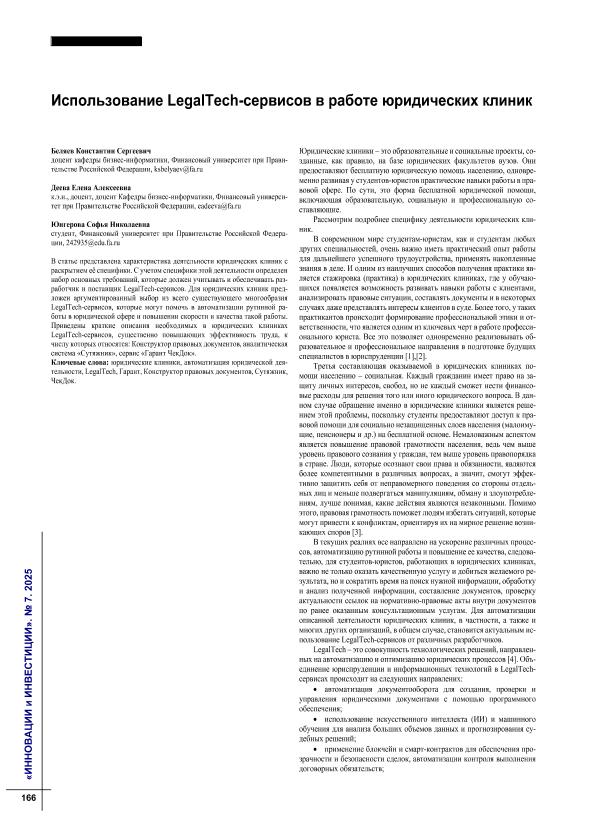 Беляев, К.С. Использование LegalTech-сервисов в работе юридических клиник / К.С. Беляев, Е.А. Деева, С.Н. Юнгерова // Инновации и инвестиции. – 2025. – № 7. — С. 166-168. — Только в электронном виде. — <URL:http://elib.fa.ru/art2025/bv1931.pdf>.
