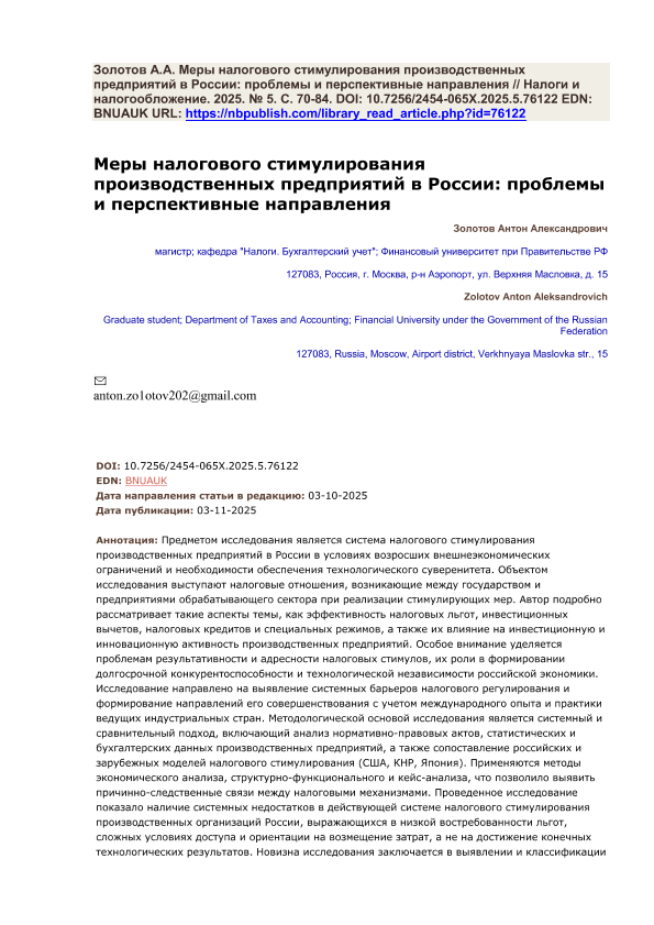 Золотов, А.А. Меры налогового стимулирования производственных предприятий в России: проблемы и перспективные направления. — Текст: электронный // Налоги и налогообложение. – 2025. – № 5. — С. 70-84. - URL: https://nbpublish.com/library_read_article.php?id=76122. - Дата публикации: 03.11.2025 — <URL:http://elib.fa.ru/art2025/bv2225.pdf>.